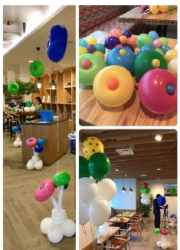 外資系自動車メーカーさんの社内交流イベントで、オフィスのカフェテリアに作品を飾りました。多様性がテーマで、イメージロゴもお示しいただいたので、ロゴのデザインをモチーフに立体の作品を創作しました。置き型のヘリウムブーケになっている作品と、腕輪にもなるテーブルに置く作品。会場のあちらこちらに並べると、いつものカフェテリアが祝祭空間に早変わり。ご担当者様から「大変イベントらしくなりました。社員に大変好評で、イベント終了後も社内の様々な箇所に飾られておりました。」と喜びのメッセージをいただきました。